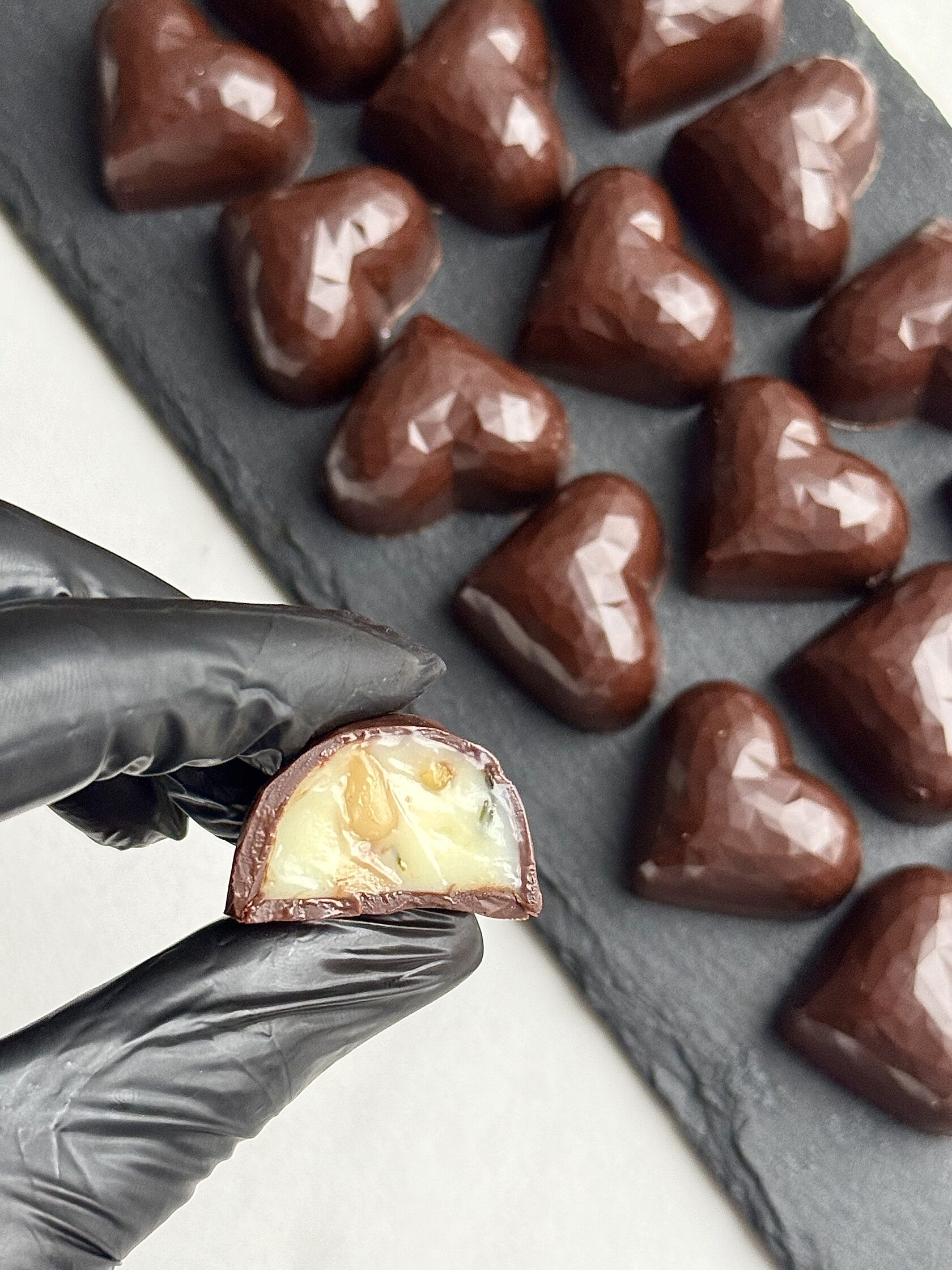Ганаш на белом шоколаде с добавлением тимьяна и натуральных кедровых орешков. Корпус - тёмный шоколад