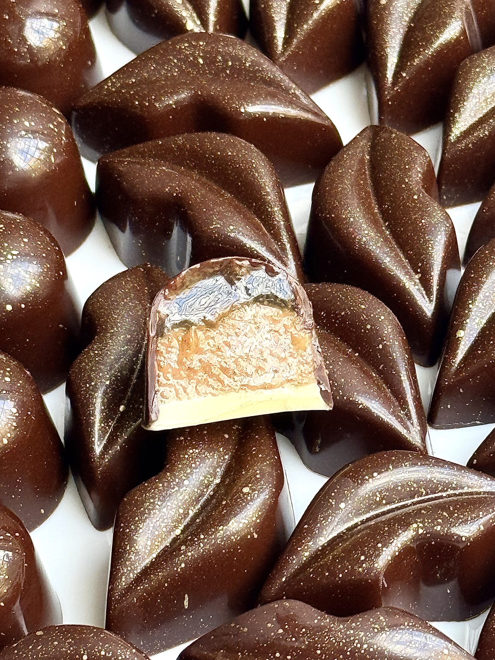 Джандуйя на тандеме карамельного и молочного шоколада с добавлением арахисовой пасты. Внутри цельный арахис. Корпус - молочный шоколад