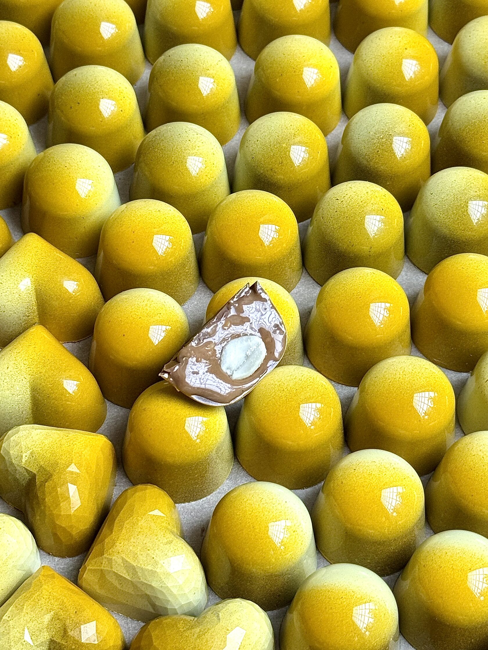Лимонная редукция + Миндально - карамельный слой на карамельном шоколаде с щепоткой соли. Корпус - тёмный шоколад