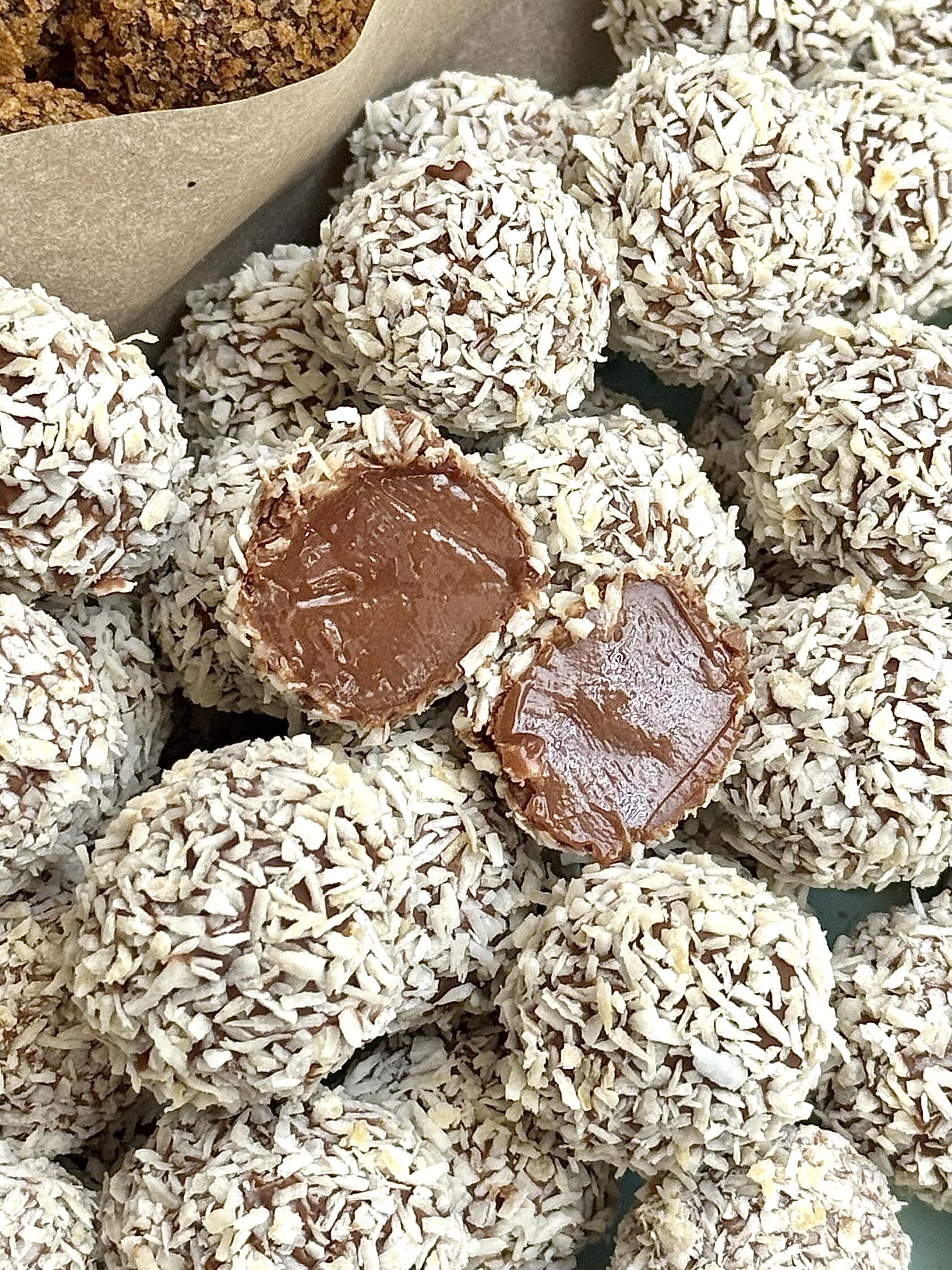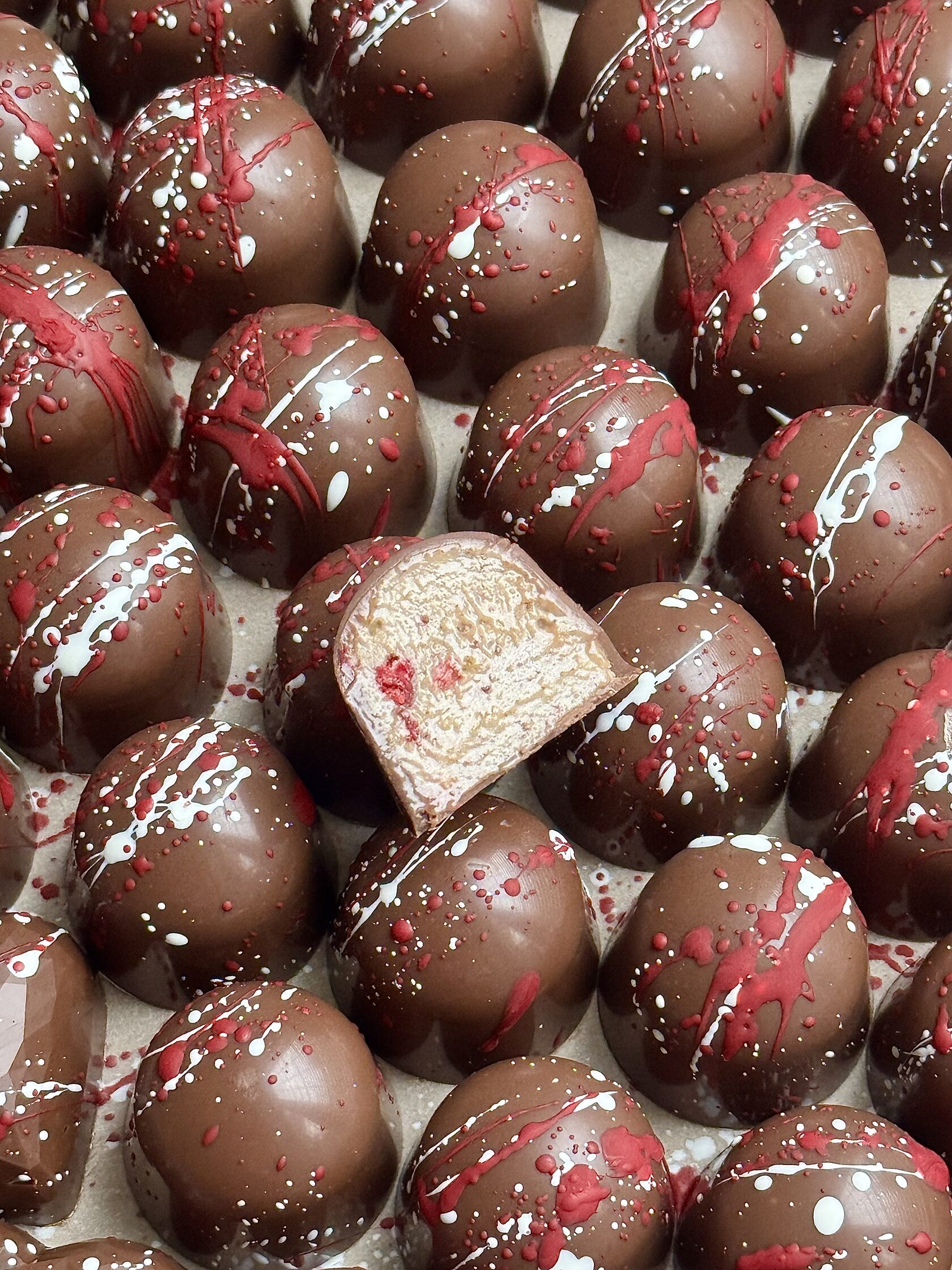 Ганаш на молочном бельгийском шоколаде с добавлением малинового пюре и кокосового масла. В обливке из молочного шоколада с кокосовой стружкой