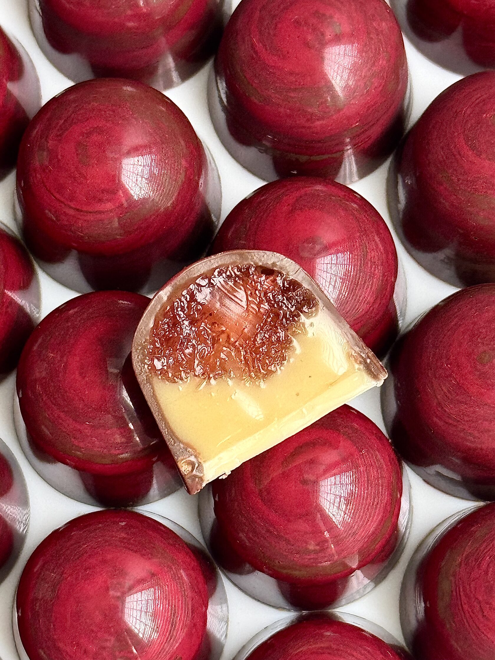 Клюквенное желе + Арахисовый ганаш с солью на белом шоколаде. Корпус - молочный + белый шоколад