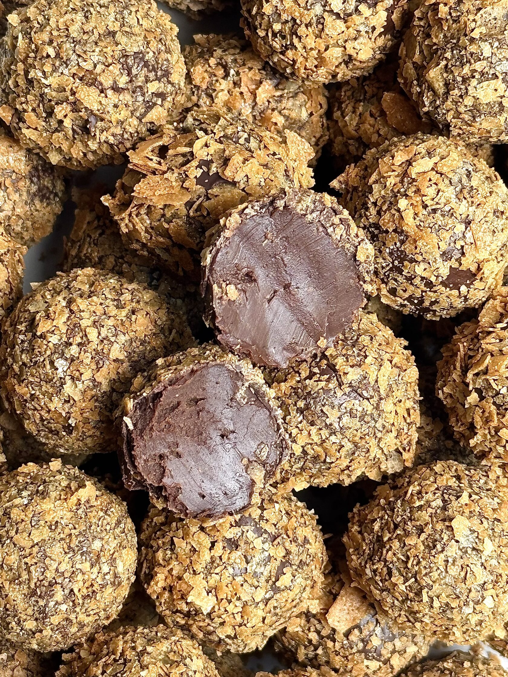 Ганаш на тёмном бельгийском шоколаде с бурбонской ванилью. В обливке из тёмного шоколада с бельгийской вафлей