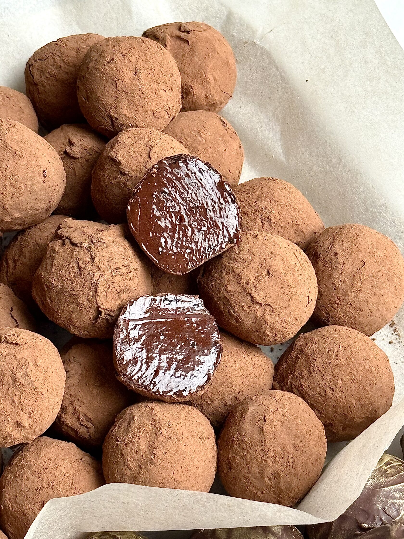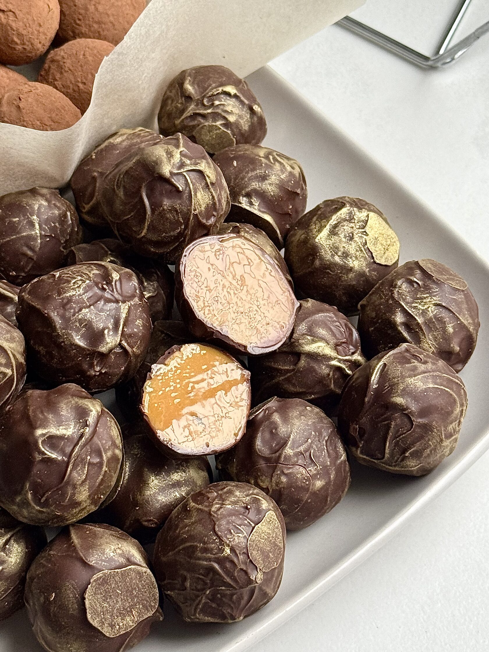 Ганаш на карамельном шоколаде с манго и тимьяном. В обливке из тёмного шоколада