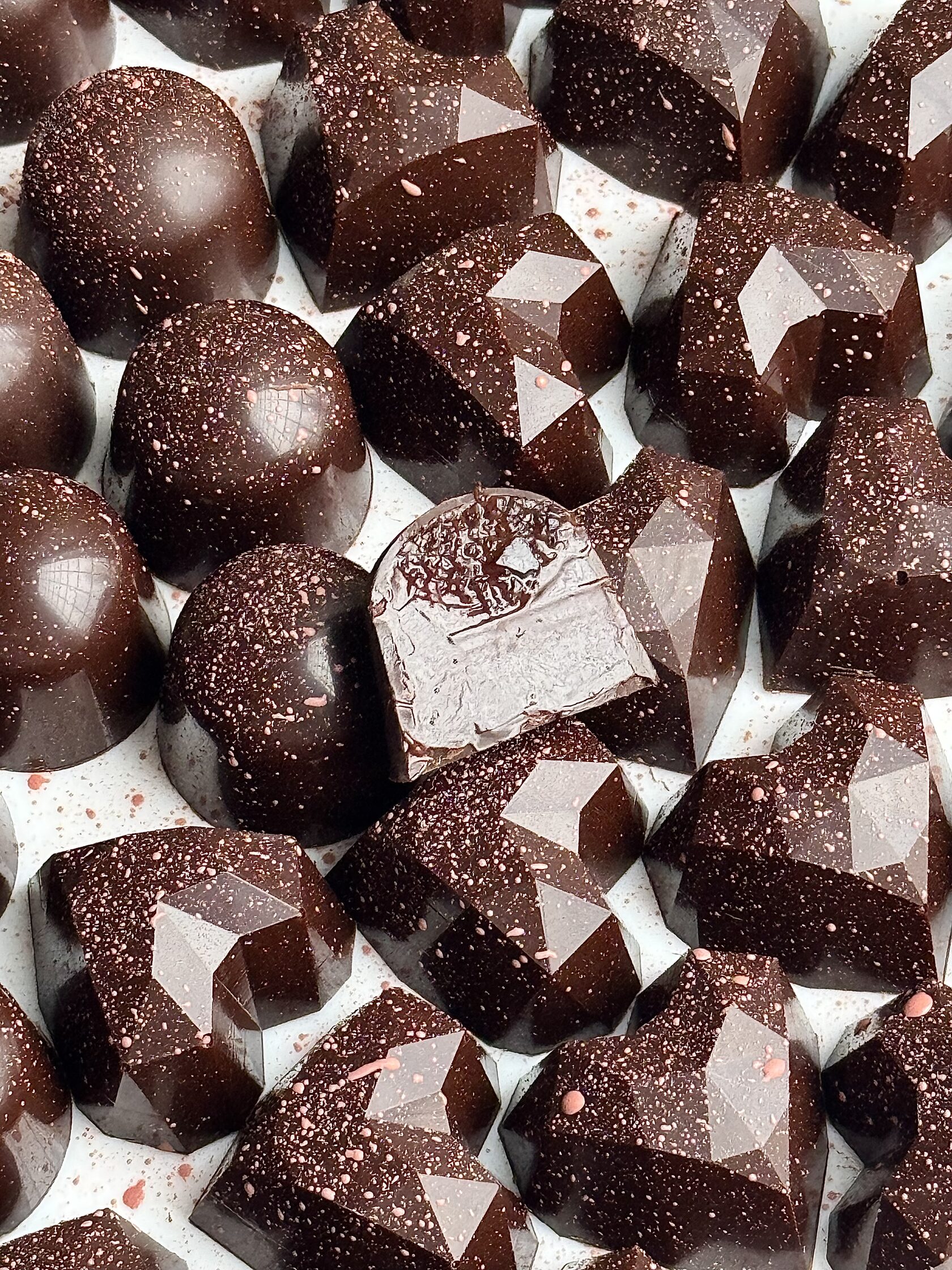 Клюквенное желе + Ганаш на темном шоколаде с добавлением розмарина. Корпус - тёмный шоколад